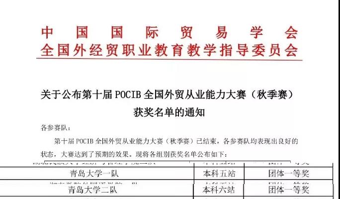 国际商务系二十位同学组成的两个团队在第十届POCIB全国外贸从业能力大赛中荣获两项团体国家一等奖,1项个人国家一等奖、5项个人国家二等奖、9项个人国家三等奖。
