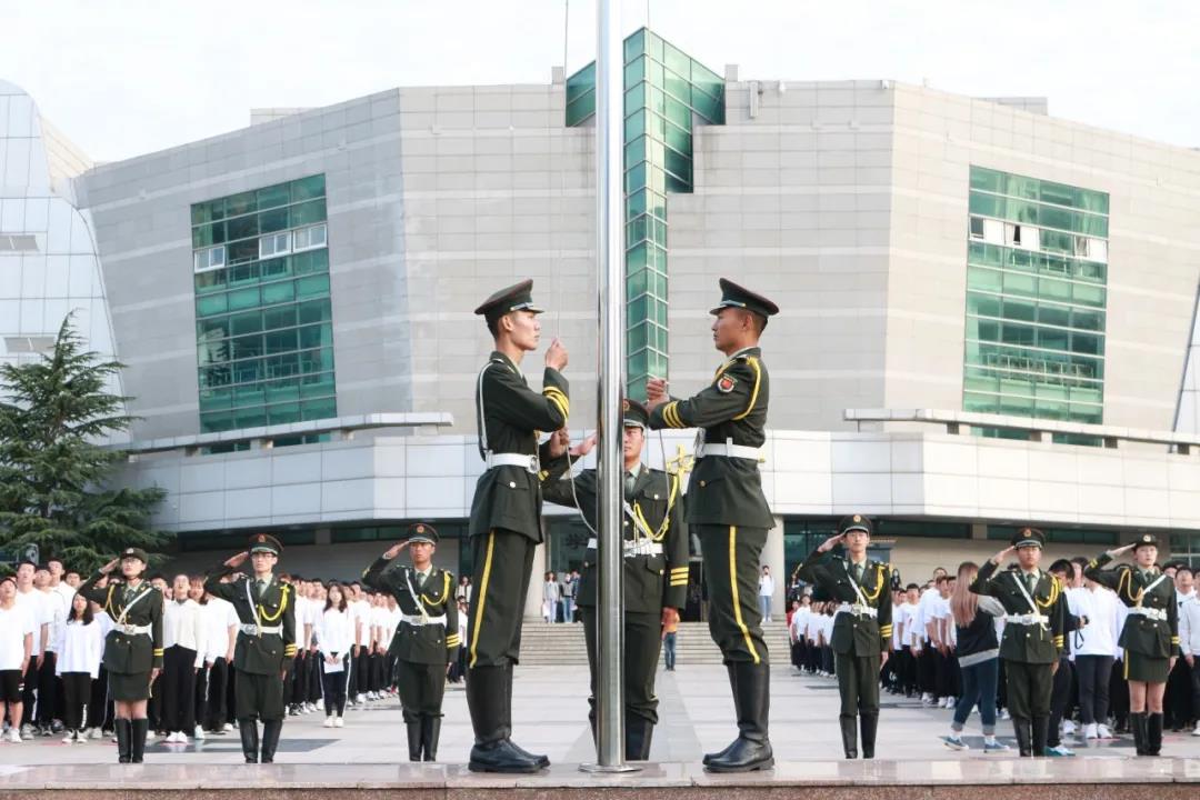 在一片庄严肃穆的气氛中,国旗班成员迈着铿锵的步伐,护送着国旗走向升旗台。在雄壮有力的国歌声响起的那一瞬间,全体师生的眼睛注视着五星红旗冉冉升起,心灵伴随着祖国母亲一起搏动,民族自尊自豪的热血在每一个人的血管中汹涌澎湃。晨光下的那抹鲜红,代表着无数革命先辈为民族抛头颅洒热血的光荣历史,昭示着中国71年来披荆斩棘稳健前行的风雨征程,也照耀着中华儿女自强不息奋勇前行的民族精神!