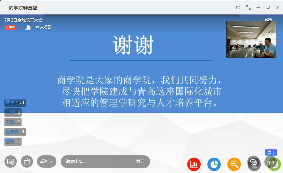 会上,王庆金院长从学院人才培养、学科工作、科学研究、教师发展四个方面总结了学院上半年工作取得的成绩。下半年的工作将重点围绕提高2021届毕业生考研率、推进本科导师制度,做好博士点申报、学科评估以及项目、论文、奖励、经费持续跟踪方面进行了全面部署。勉励全体老师共同努力,尽快把学院建成与青岛这座国际化城市相适应的管理学研究与人才培养平台。