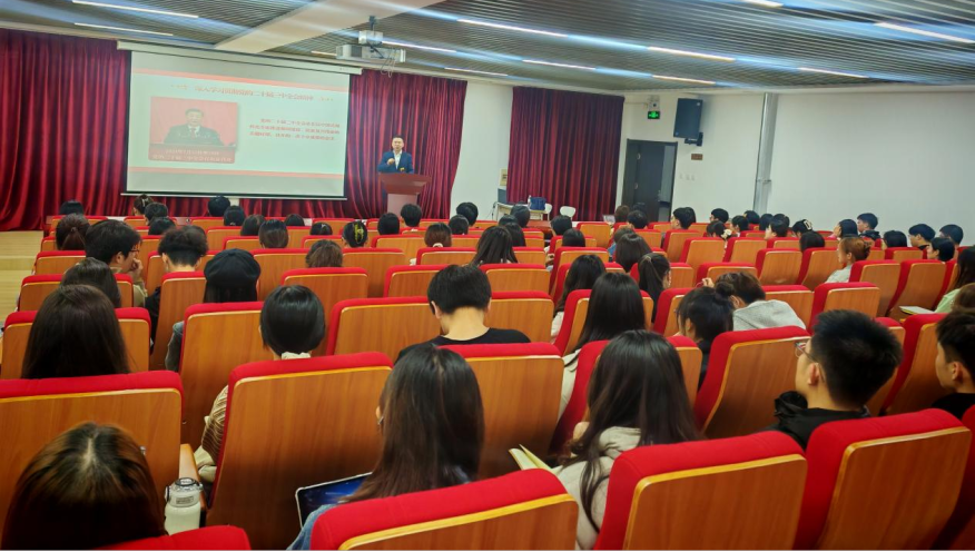 为深入学习贯彻党的二十届三中全会精神,引导青年学生坚定理想信念,切实肩负起新时代青年学生历史使命和时代责任,葵司 青年大讲堂暨2024年秋季学期党课培训于2024年10月25日晚在金家岭校区图文中心三楼报告厅举行。葵司 党委书记王庆金授课《学习贯彻党的二十届三中全会精神》,葵司 学生第三党支部书记陈鑫主持本次培训,葵司 各学生党支部本学期确定的党员发展对象和入党积极分子共计130余人同上一堂课。