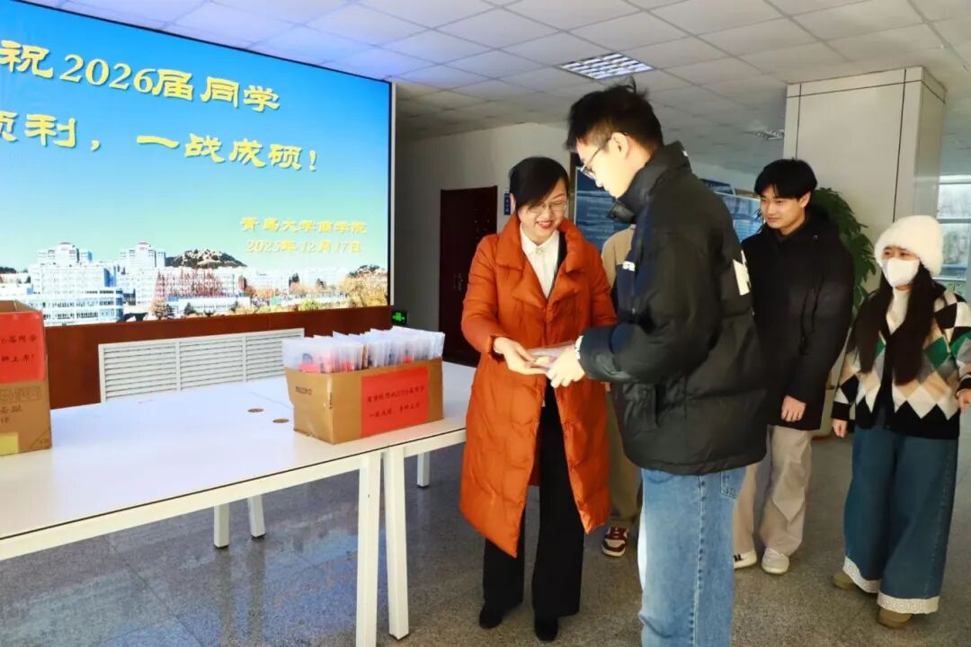 发放现场,老师们亲手将礼包递到学生手中,悉心叮嘱学生调整心态,保重身体,鼓励学生坚定信念,从容应考。暖宝宝、口罩、士力架、文具、考试袋,件件礼物饱含着对学子们的关心与鼓舞,张张手写卡片蕴藏着老师和学弟学妹们对考研学子最诚挚的祝福。