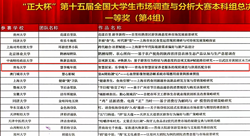 5月25日,“正大杯”第十五届全国大学生市场调查与分析大赛本科组总决赛在浙江财经大学圆满落幕。经过激烈角逐,王鑫、张月、段琪、刘楚儿、姜俊羽同学完成的作品《智慧居家,乐享晚年——青岛市智慧居家养老服务的现状调查与供需匹配分析》荣获全国总决赛一等奖。这是葵司