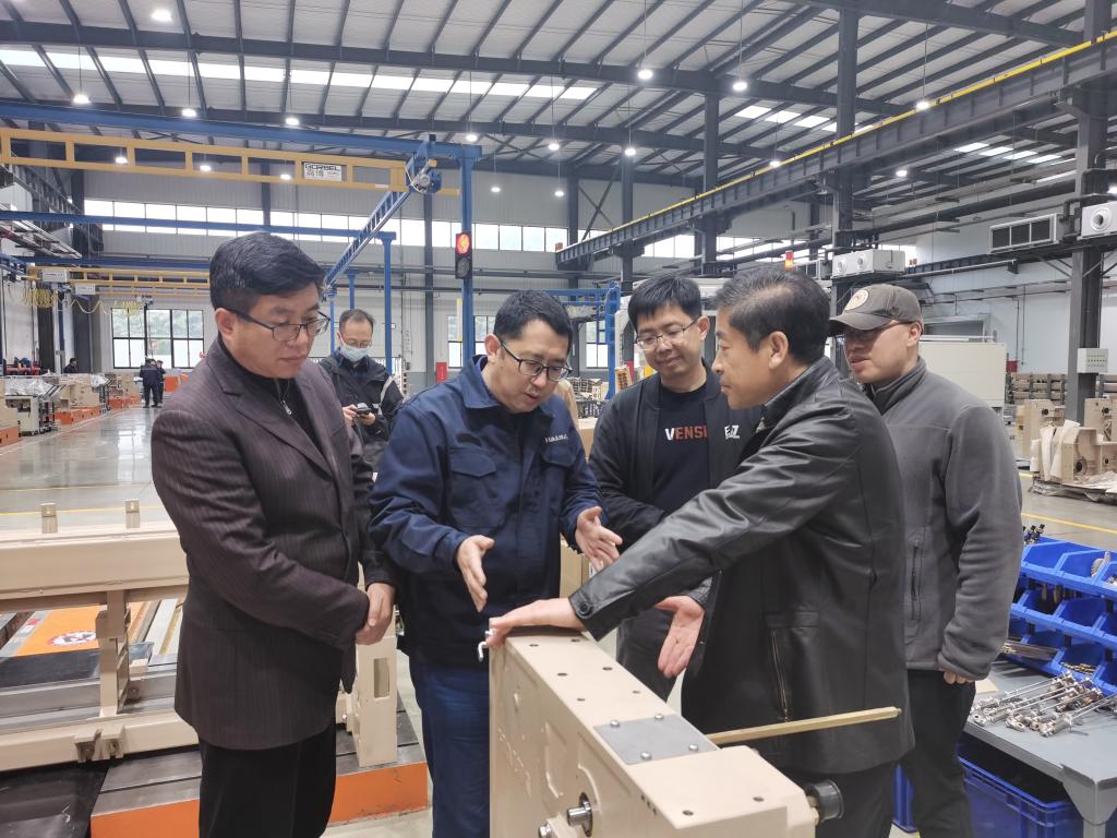 一行参观了海佳集团临港工业区新厂区。青岛海佳集团公司初创于1995年,专注于无梭织机领域,目前公司实现年产10000台无梭织机生产能力,年产值达到7亿元。临港工业区的新厂区始建于2019年,公司投资3亿元建设纺织机械智能制造工厂,通过开展高端无梭织机数字化和标准化生产流程、数字化生产装备系统、全流程信息化管理系统开展研究,开发出高端无梭织机数字化生产流程、数字化生产装备、质量在线监测系统全流程信息化管理系统,建立起年产一万台高端无梭织机的数字化工厂。