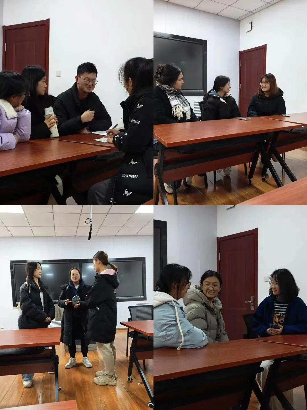 分组完成后,各小组的成员们聚集在门外,他们积极地相互认识,手中紧握着各自的书面材料,热情地交流着。他们的眼神中闪烁着紧张与兴奋的光芒,彼此之间互相鼓励,以一种乐观的态度迎接即将到来的未知面试挑战。