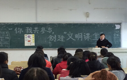 由副班长宣读班主任于坤老师关于文明课堂对同学们的寄语,提出了关于建设文明课堂的两方面的的对策:一是实现“无手机绿色课堂”的对策1.学校制定相关措施如安装屏蔽仪。2.教师高教学水平,调动学生积极性。二是提出了关于学风建设的问题:1.必须学好专业基础知识,化严峻的就业压力为动力。2.培养自己多方面的能力,积极参加各项活动。辅导员李晓涵老师讲话,发起征文活动——文明课堂之我建。