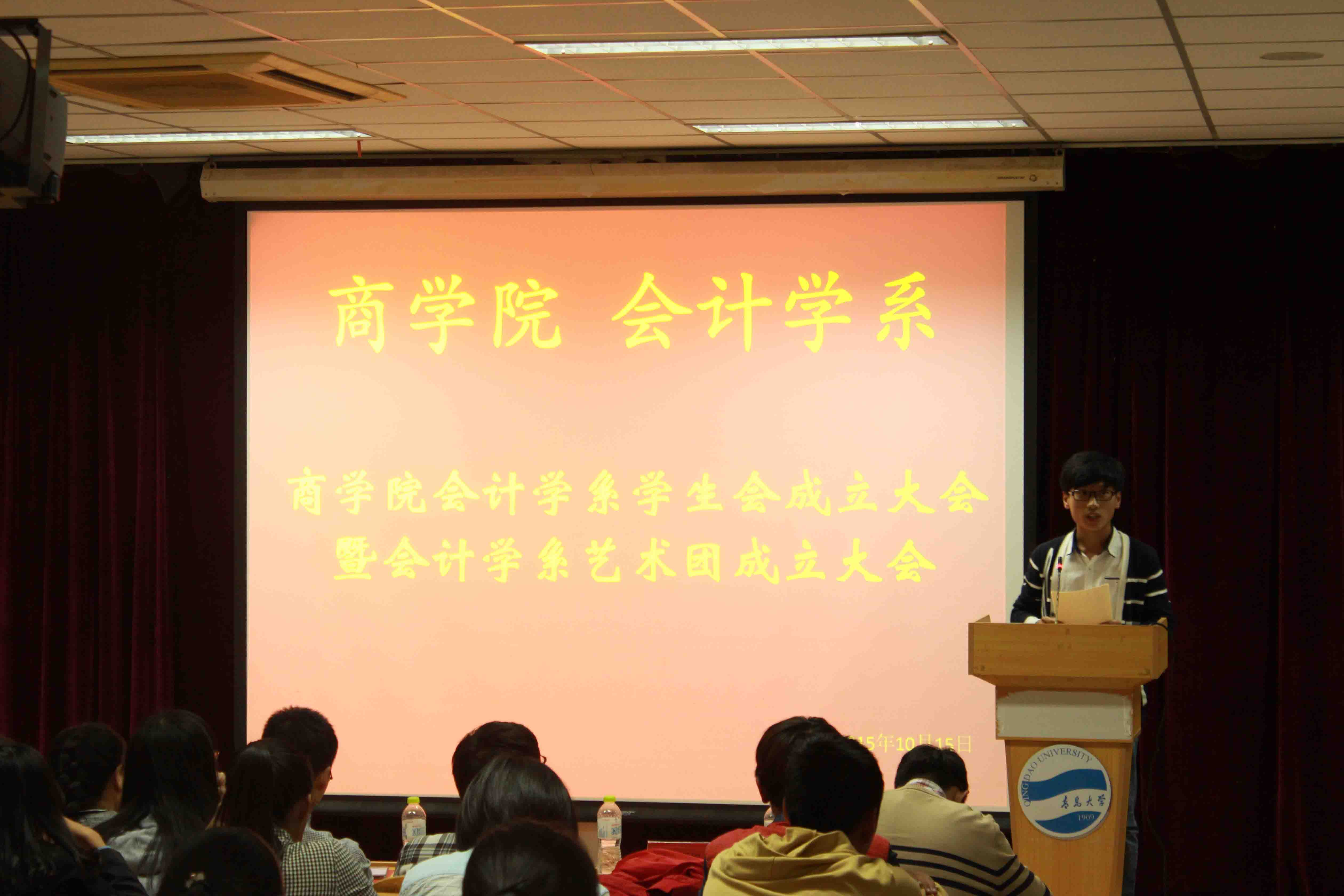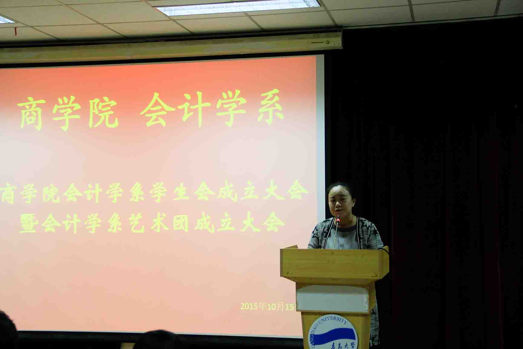 会计学系学生会成立大会暨会计学系艺术团成立大会在东校区图文中心三楼报告厅隆重举行。会议由会计学系学生会文艺部部长禚玥同学主持,会计学系团总支书记、会计学系12级辅导员陈鑫老师,葵司