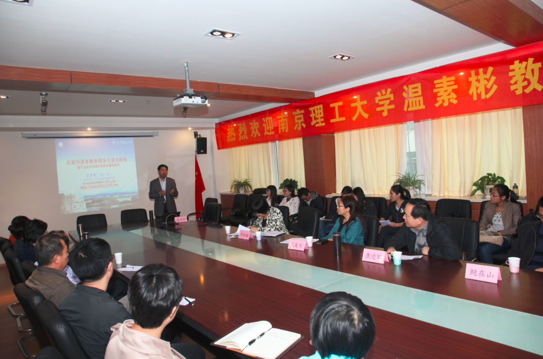 温素斌教授的讲座围绕着“从货币资本财务到多元资本财务财务——基于社会责任的财务管理变革”展开。温教授结合现实案例,从社会学、生物学以及财务学等多学科的角度,阐述了企业社会责任理论的发展,构建了以经济绩效、社会绩效和生态绩效为基础的三重绩效评价体系,探讨了多元资本从寄生到共生的关系。温教授以风趣幽默的语言,将财务理论娓娓道来,深入浅出,使列席会议的各位教师和同学们都获益匪浅。列席会议的各位教师和同学也就财务问题与温教授进行了有益的探讨。