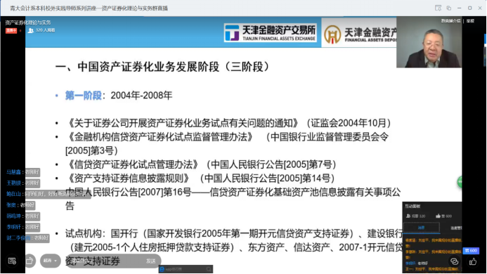为了开拓专业视野,培养本科生的实践能力,会计学系近日举办了本科校外实践导师专题讲座,本次讲座聘请了我系校外实践导师、青大优秀校友、天津金融资产交易所副总裁刘世平老师。刘世平老师长期从事评级、资管、证券化业务,具有深厚的理论功底和丰富的实践经验,本次讲座的题目是“资产证券化理论与实务”,刘老师结合自己的实践经验介绍了资产证券化种类及实务操作问题,同时还就不良资产处置问题介绍了自己宝贵的经验,引起了同学们的强烈反响。