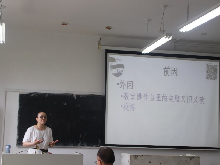 在各位老师陆续到来并做好会议签到之后,刘锦老师做了简单的开场介绍,教师发展活动便正式开始。刘锦老师通过前因、过程和结果三个环节讲述了自身录制教学视频的初衷、录制经验以及到目前为止的成果。