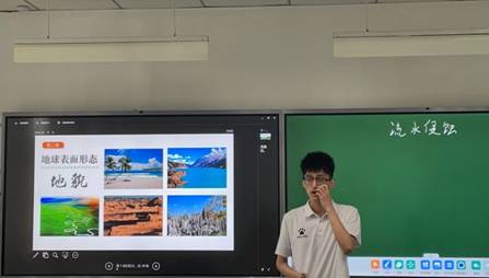 张振煜:河流侵蚀地貌是高中必修内容,内容相对难度较大,课堂设计方面以电影片段进行引入,激发学生的学习积极性并且复习地转偏向力的相关知识,为这节课后面要讲的内容做了铺垫。接着播放了流水侵蚀的实验视频,引出了下蚀、侧蚀、溯源侵蚀。最后从时间方面和空间方面,对内容进行进一步的讲解。