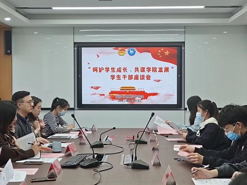 为进一步提高学生干部的综合素质,鼓励为学院进一步发展献言献策,2022年4月21日下午,旅游与地理科学学院于浮山校区科技研发大楼A座509会议室成功举办“呵护学生成长,共谋学院发展”学生干部座谈会。院党委副书记于苗和团委负责人刘阳出席本次会议,院学生会主席团及2020级全体学生会成员参与本次会议。