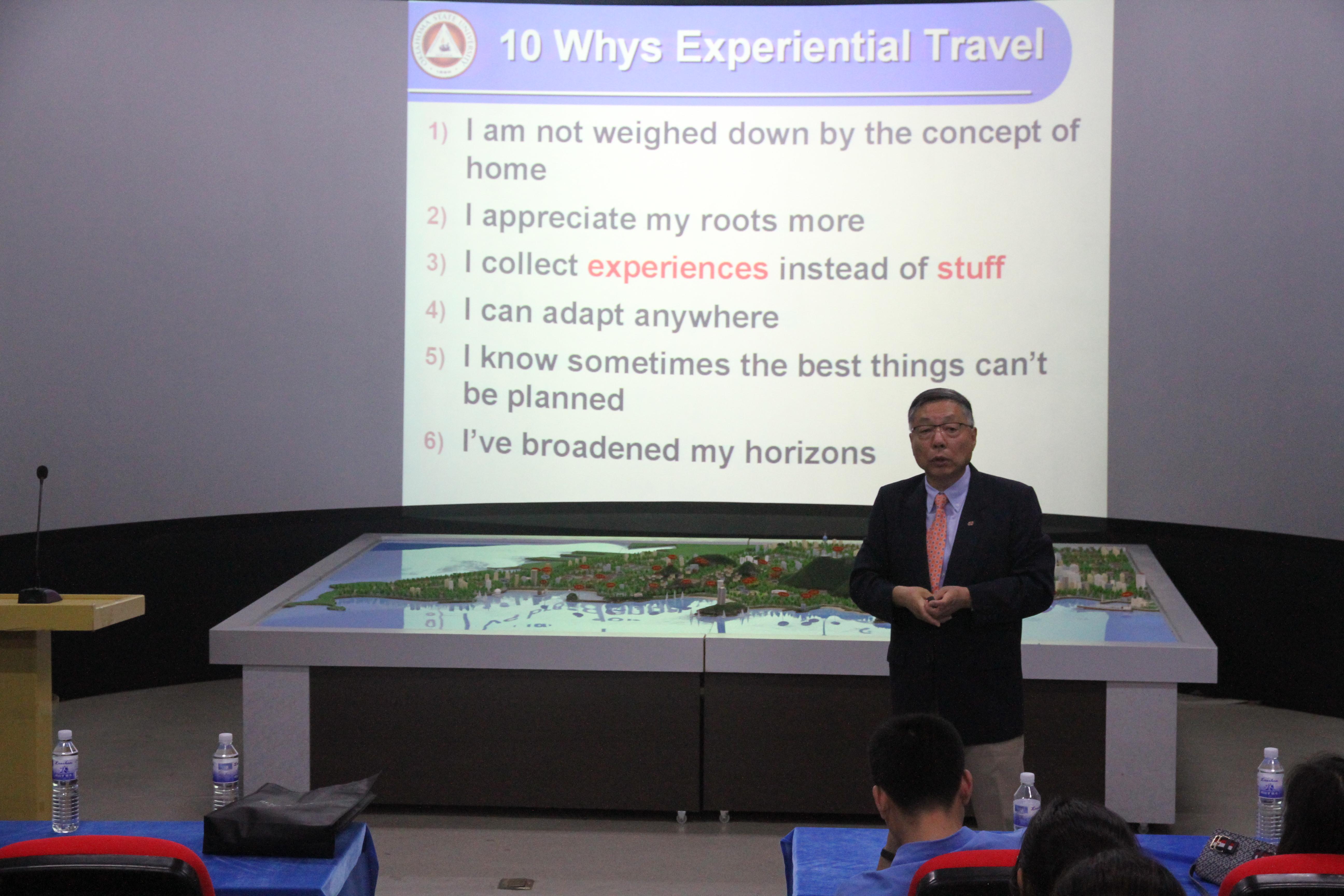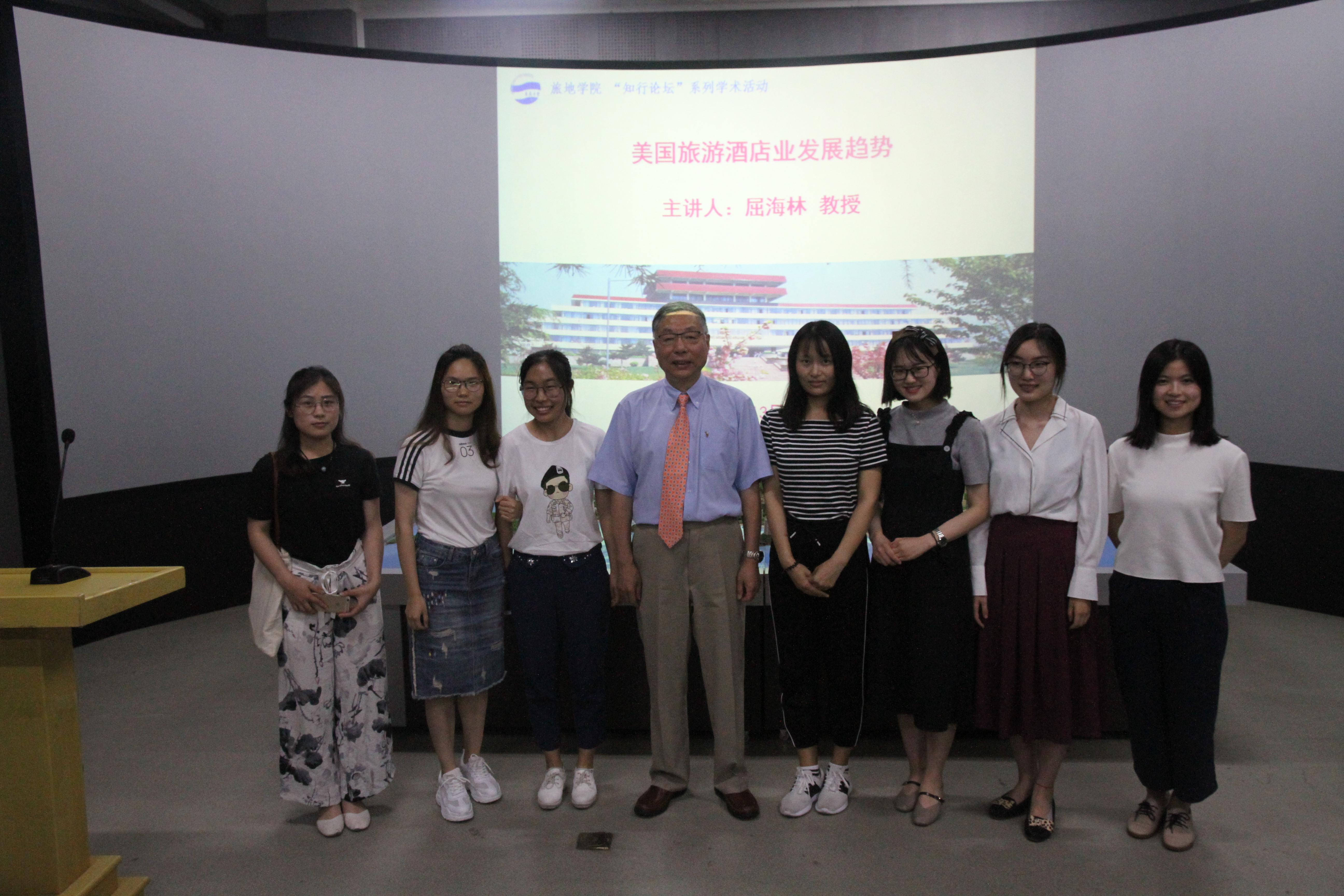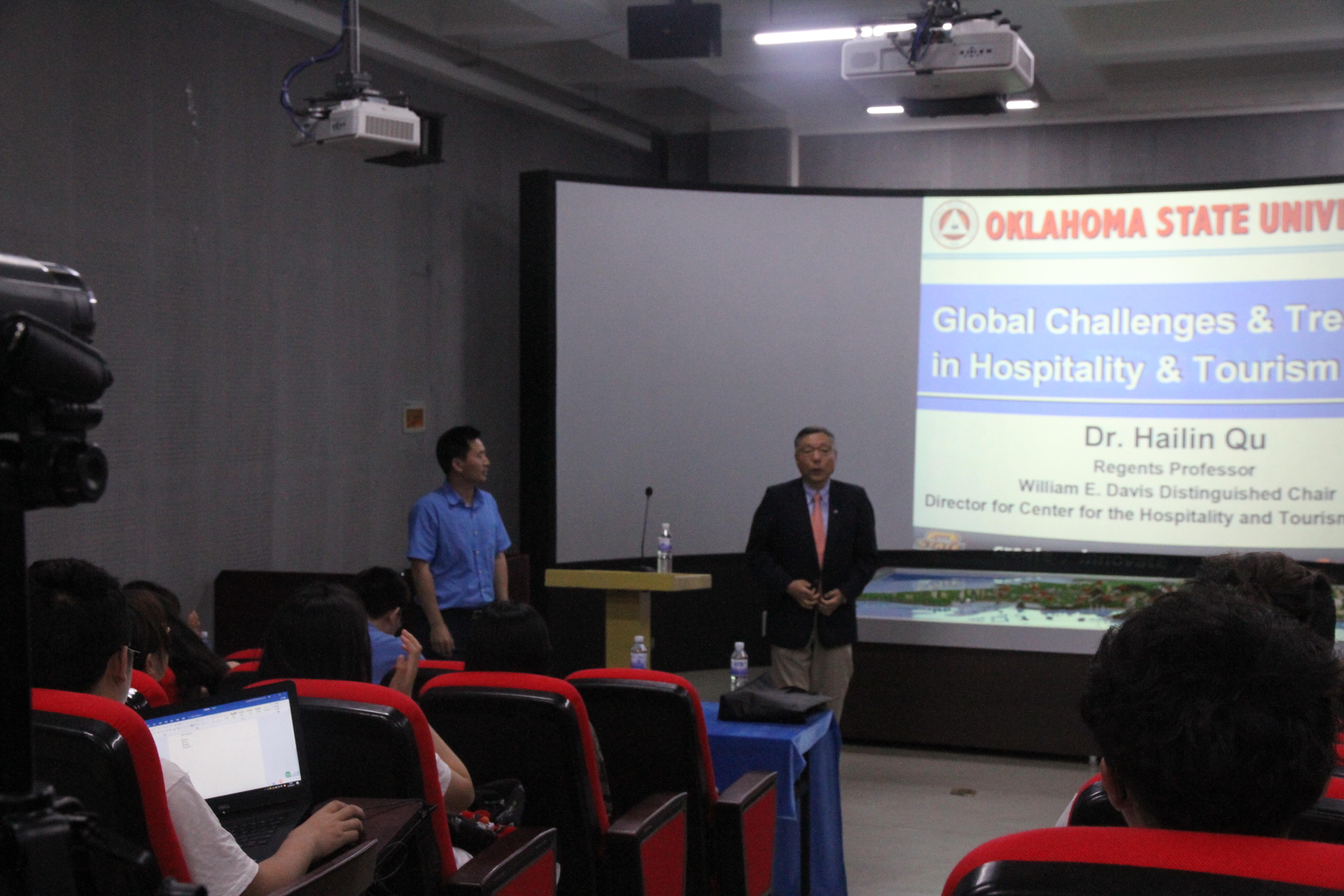 浮山校区静思楼2号旅游数字实验室举办“美国旅游酒店业发展趋势”学术报告会。本次学术报告特邀美国俄克拉荷马州立大学(Oklahoma State University)屈海林教授做学术交流报告,学院教师及学生代表参加了本次活动。