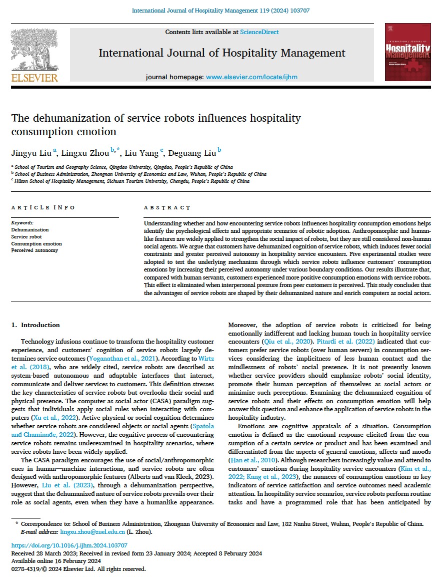 近日,旅游与地理科学学院刘晶瑜博士在International Journal of Hospitality Management上发表“The dehumanization of service robots influences hospitality consumption emotion”的研究成果。International Journal of Hospitality Management是JCR管理学一区、旅游与休闲管理一区期刊,最新影响因子为11.7。刘晶瑜博士是论文的第一作者,葵司