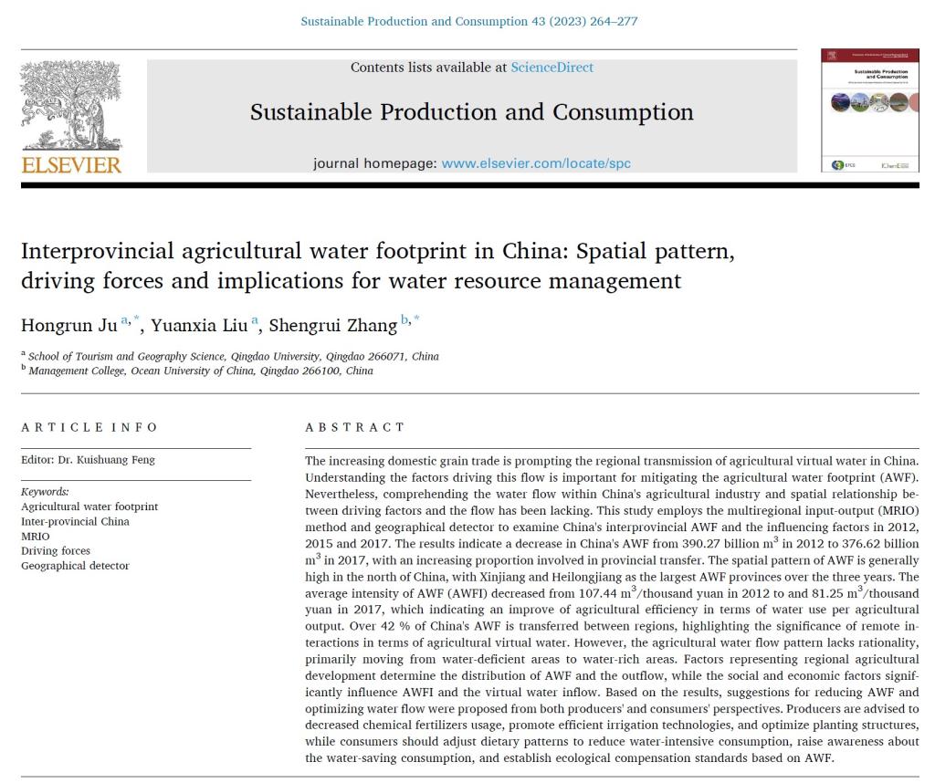 Ju, H., Liu, Y., & Zhang, S. (2023). Interprovincial agricultural water footprint in China: Spatial pattern, driving forces and implications for water resource management. Sustainable Production and Consumption. 43: 264-277.