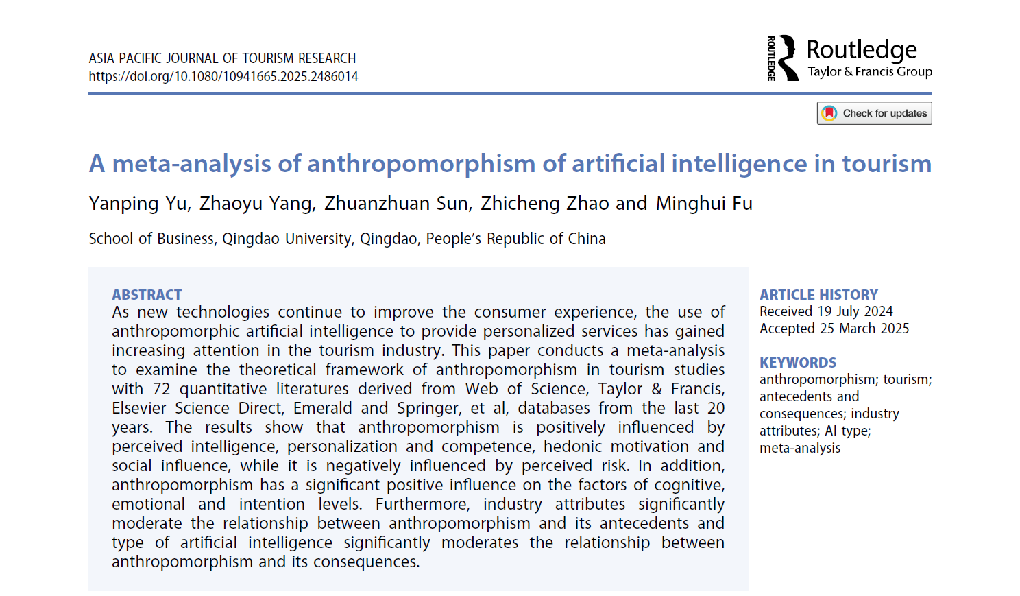 旅游管理系教授于岩平研究团队的原创性研究成果“A meta-analysis of anthropomorphism of artificial intelligence in tourism”在国际学术期刊Asia Pacific Journal of Tourism Research(JCR一区,影响因子4.3)上正式发表,葵司