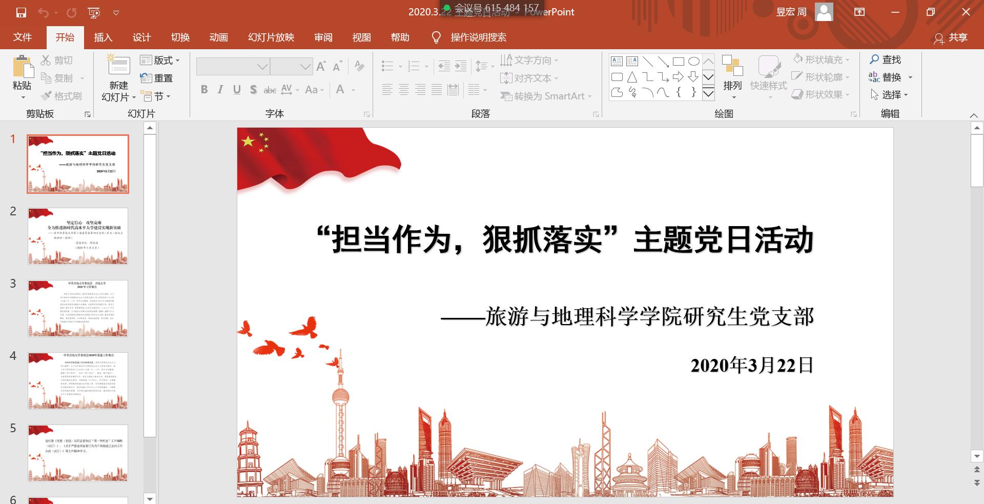 3月22日,旅游与地理科学学院研究生党支部通过腾讯会议平台开展“担当作为,狠抓落实”主题党日活动,支部全体党员参加了本次会议,会议由研究生党支部书记周昱宏主持。