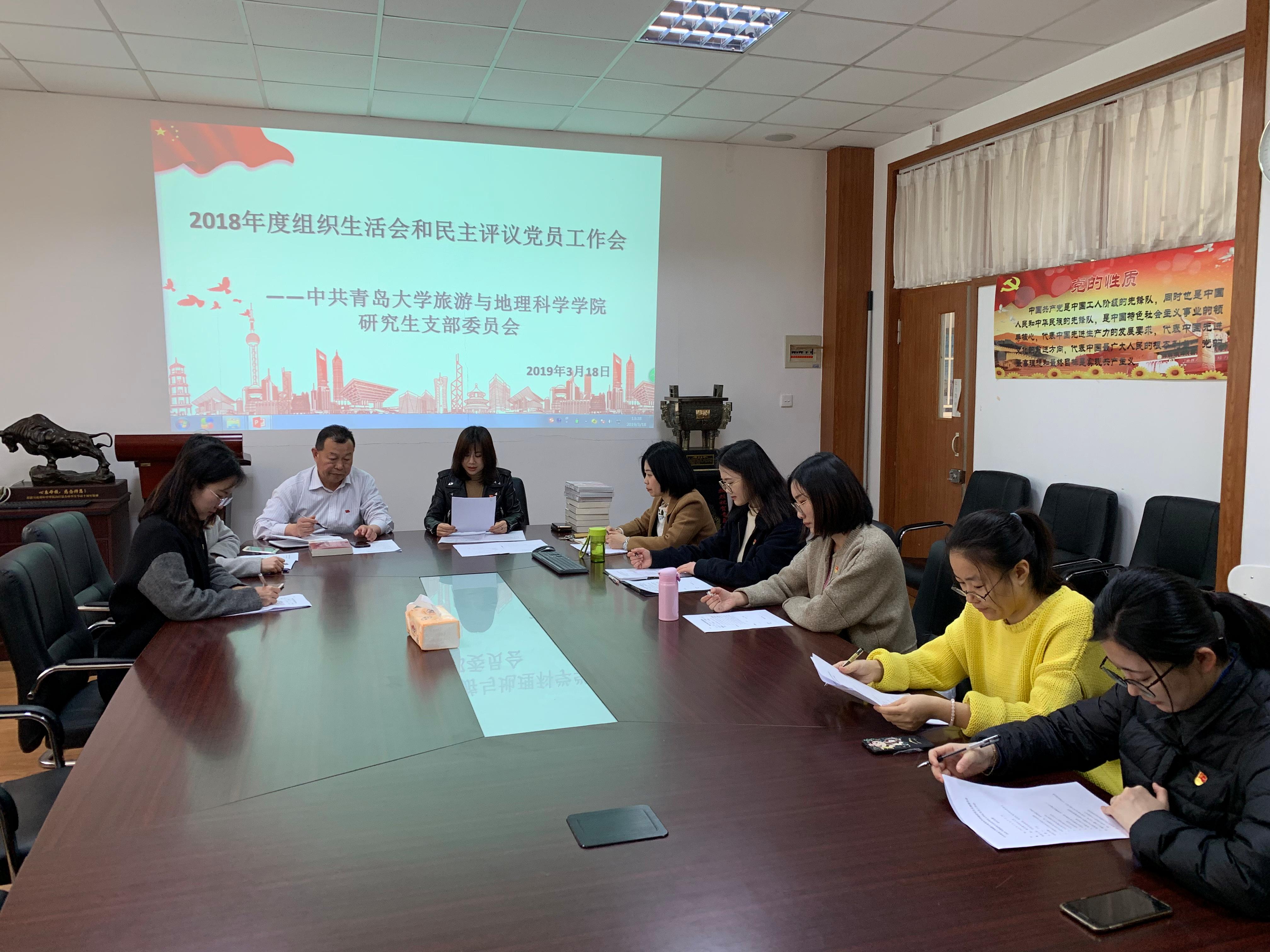 旅游与地理科学学院研究生党支部组织召开了2018年度组织生活会和民主评议党员工作会议,院党委书记刘善东同志出席本次会议,研究生党支部全体党员参会,会议由院党委副书记、研究生党支部书记于苗主持。