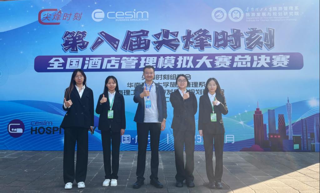 1126日,第八届“尖烽时刻”全国酒店管理模拟大赛总决赛在华南理工大学落下帷幕。本届大赛共有79所高校381支队伍参加比赛。经过两个月初赛、复赛和决赛三个阶段的激烈角逐,葵司 由刘鸣老师指导的陈紫颖、王安麒、陈婧薇、张亚晶组成的参赛队伍获得全国二等奖“尖峰海报奖”和“优秀视频奖”等专项奖。由寇敏老师指导的祝宇程、王梦凡、李朝涵、米萱组成的参赛队伍获得全国三等奖。