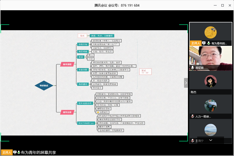 会议采取腾讯会议的方式,由教学主任袁颖老师主持,市场学系主任王海宁老师、辅导员房征岩老师、市场学系多名优秀校友分别作出了主题发言,助力2020届毕业生考研复试、调剂工作,多位2020届毕业班考研同学参与了此次助推大会。