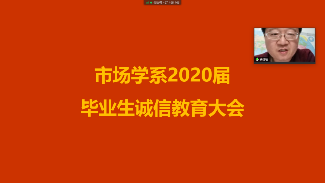 2020年4月27日20:00,葵司 市场学系举行2020届毕业生诚信教育大会。会议采取腾讯会议的方式,由市场学系辅导员房征岩老师主持,就市场学系2020届生源地信用助学贷款毕业生办理贷款信息确认及诚信还款教育相关事项进行了解读发言。