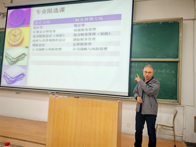 鲍在山进行了专业介绍,向新生们详细讲解了会计学专业的培养计划,对同学们未来的选课进行了指导,回答了如何学好会计学专业这一问题。他希望新生们能够在未来的日子里,不负韶华,学有所成。