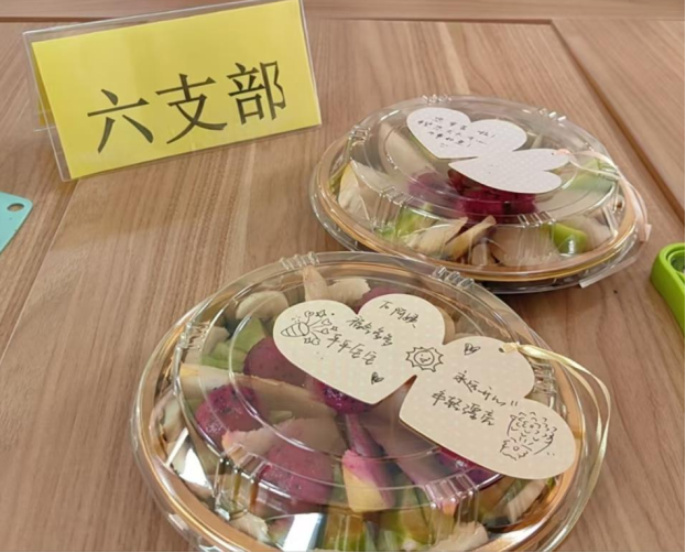 制作完成后,各小组派代表将果盘送至后勤岗位,收到礼物的工作人员纷纷表示“很惊喜很感动非常感谢同学们的关怀”。