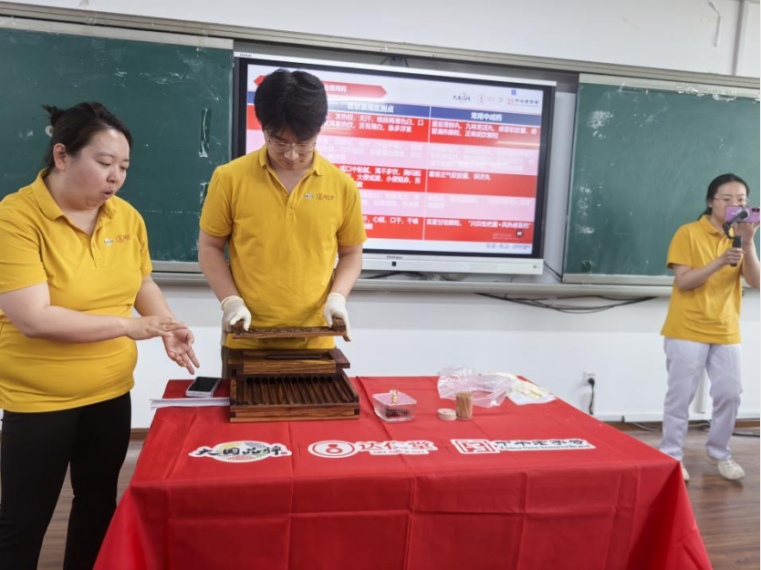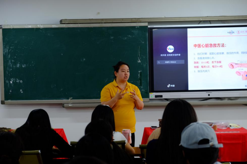 活动邀请天津医药集团金牌葵司大使、天津市青年岗位能手张瑶老师以“端午时节防暑热,草药提神护安康”为主题,结合《黄帝内经》夏季养生理念,详解艾叶、薄荷、佩兰等端午特色药材的提神醒脑功效,并针对高温易发的头晕倦怠、湿热困乏等症状,教授师生科学配伍香囊的实用技巧。“原来端午挂艾草不仅是习俗,更是古人防病养生的‘天然方案’!”在场学生纷纷表示收获颇丰。