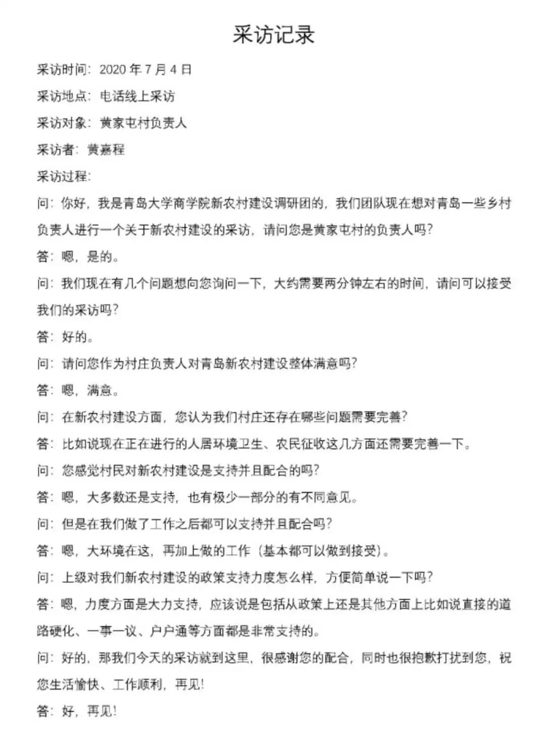 利用中午休息时间,成员们讨论了有关线上采访部分乡村负责人的问题,主要采访莱西市黄家屯村负责人、平度市东王戈庄村负责人、即墨区韩流庄村负责人。三位负责人就对青岛新农村建设的整体满意度、不满之处、村庄还存在哪些需要完善的地方、村民及上级政府对新农村建设是否支持并配合这几方面做出回答,使我们获取了更多关于村官眼中不一样的新农村建设,为本次调研活动的提供了宝贵的信息。