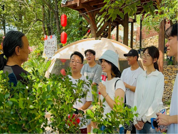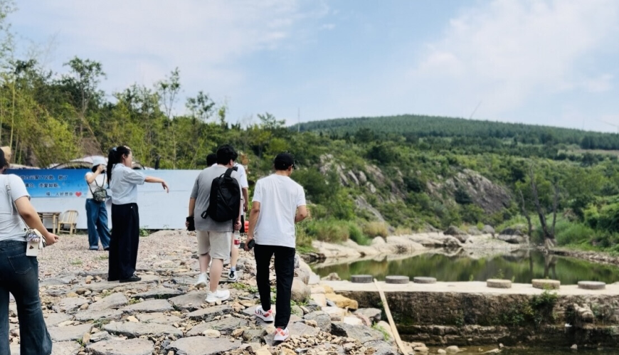 离开“半亩山塘”后,实践团来到“山谷农舍”参观考察。古朴雅致的农舍建筑与周边自然景致相映成趣,成员们细致走访了客房布局、公共活动空间及特色景观区。期间,实践团与农舍创始人郭总围绕现代青年群体“寻静”消费趋势、乡村创业的差异化路径等核心议题展开深度对话。