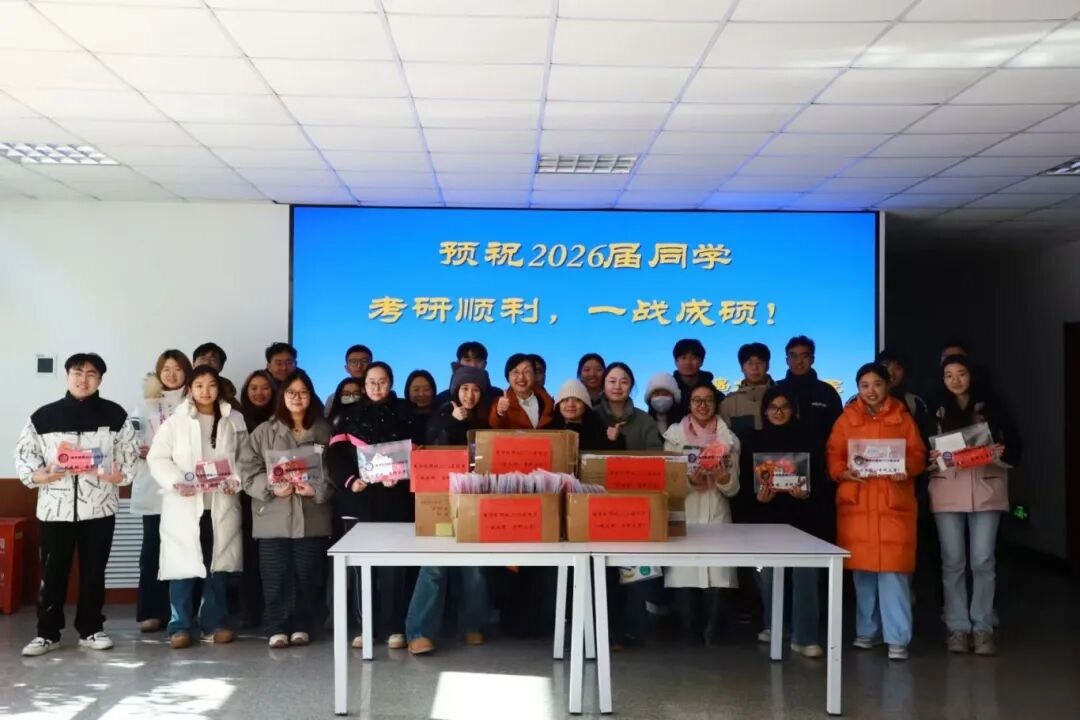 党委副书记尼梅颉、团委书记姜雪峰及2022级辅导员张瑶、陈倩倩、王梦梦、韩诗、韩煜为考研学子代表送上精心准备的助研大礼包,祝愿所有考研学子旗开得胜,一战成硕!