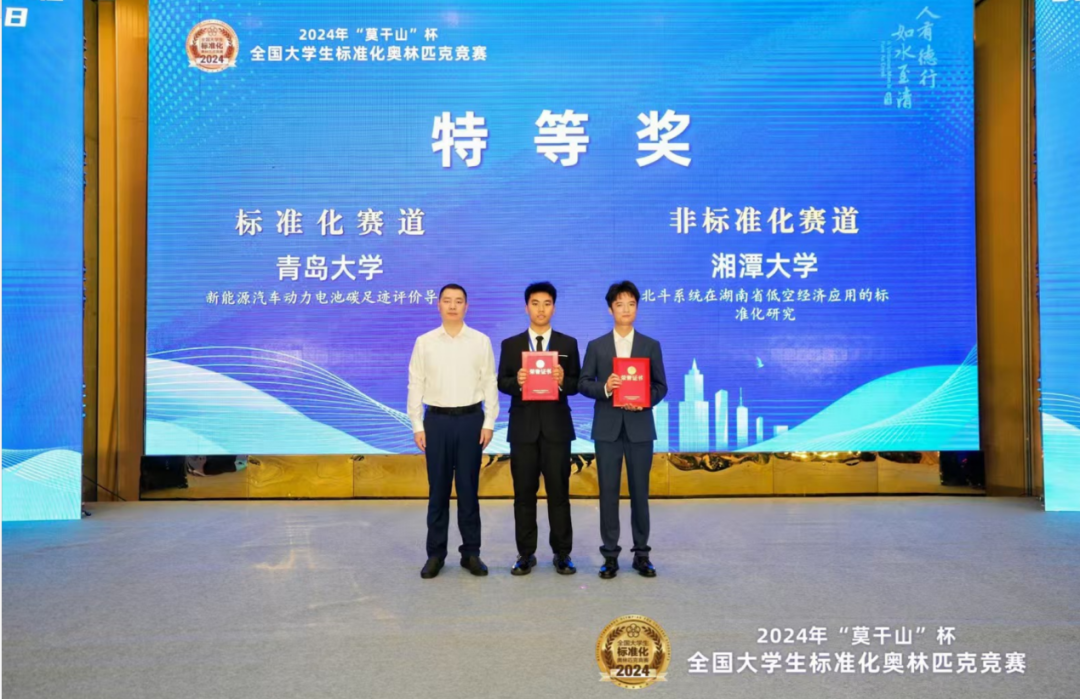 袁宇和张嵩老师指导的“碳迹无匿”团队作品《新能源汽车动力电池碳足迹评价导则》取得标准化赛道第1名的好成绩,并荣获特等奖。海晶晶和闫艳老师指导的“光宗耀组”团队《海景民宿服务规范》荣获标准化赛道三等奖。此次竞赛共吸引国内及“一带一路”国际赛道106所高校、579支队伍、3194名大学生报名参赛,参赛高校数、队伍数、人数均为历年之最。经过区域初赛、复赛层层筛选及竞赛委员会审定,最终46支队伍入围全国总决赛。