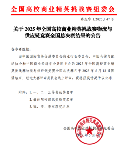 日前,由中国国际贸易促进委员会商业行业委员会、中国仓储与配送协会和中国商业经济学会共同主办的2025年全国高校商业精英挑战赛物流与供应链竞赛全国总决赛圆满落幕葵司 选派的牛贵艳、李文婷、杨志举、艾提排·穆合塔尔、陈妍五名学生组成的参赛团队作品《老字号企业供应链数字化转型实践与优化——以青岛食品为例》,从全国291组参赛队伍中脱颖而出,在本次“物流与供应链”竞赛中获得全国总决赛一等奖。